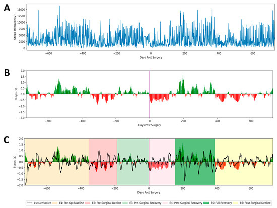 An example patient’s activity (i.e., steps taken per day) is collected across a 4-year peri-operative window (A), smoothed and normalized to each individual’s pre-operative baseline (B), and subsequently segregated into distinct temporal epochs based on the activity magnitude and rate of change (C).