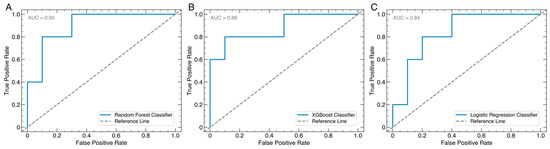 The model performance gauged by the receiver operating characteristic (ROC) curve yielded total area under the curve (AUC) values of 0.90 for RF (Figure 2A), 0.88 for XGBoost (Figure 2B), and 0.84 for LR (Figure 2C), showing that RF exhibited the greatest measure of separability.