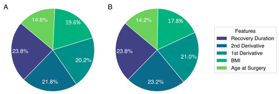 The feature importance for both RF (Figure 3A) and XGBoost (Figure 3B), the two decision tree models used in this analysis, was extracted. For both models, the duration of the immediate post-operative recovery period, when a patient is regaining their baseline physical functionality, contributed toward approximately one quarter of the total prediction. Subsequent analysis showed that a greater post-operative recovery length was correlated with a lesser probability of subsequent functional decline (r2 = −0.349). Other important features for both tree models included age, BMI, and the 1st and 2nd derivatives of the activity time series.
