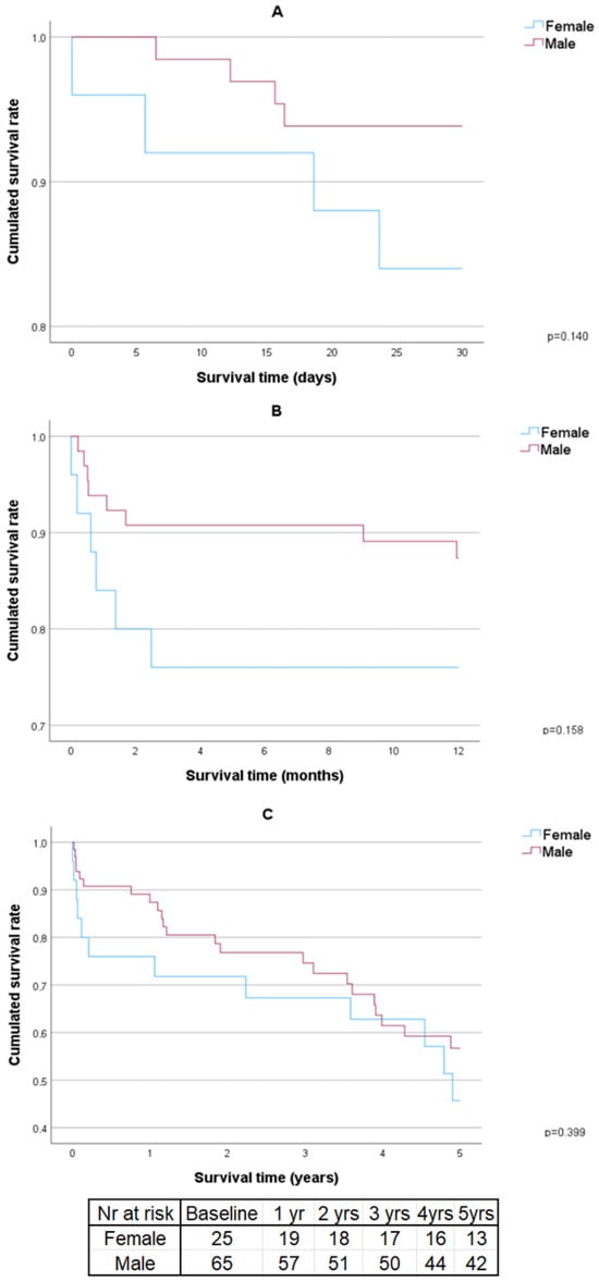 A comparison of the detailed intraoperative and postoperative outcomes for males and females can be found in Table 2. The 30-day, 1-year and 5-year survival curves with a sex comparison can be found in Figure 1A–C.