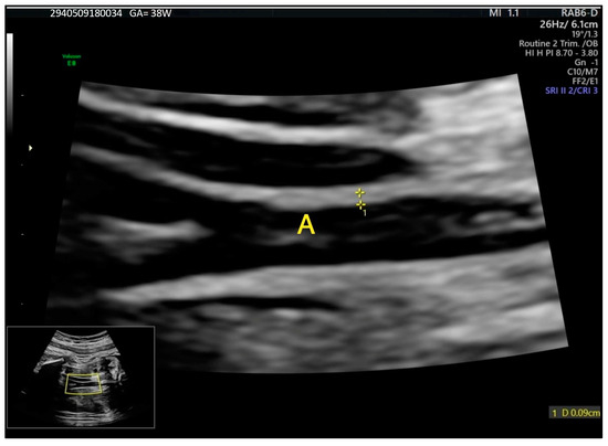 IMT of fetal abdominal aorta at 28 weeks of gestation. A—aorta. The intima is the echoic zone adjacent to the lumen and the media is the hypoechoic zone just outside the intima.