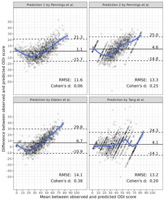 Figure 1 shows the agreement between the observed ODI scores and the respective predictions by Pennings et al., Edelen et al., and Tang et al. [20,21,33]. We find that the prediction model including six PROMIS domains used by Pennings et al. [20] performs best in terms of bias (1.1 ODI points) and average error (RMSE = 11.6). At the group level, the effect size of the difference between the observed and predicted ODI scores is negligible (d = 0.06). However, the precision of individual predictions compared to actual observed scores is poor, with 90% of the differences falling within an interval between −15.7 and 21.3 points.