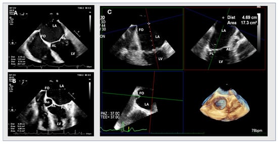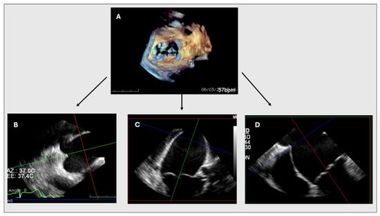 In the last decade, transcatheter treatment strategies for structural heart disease, including edge-to-edge mitral valve repair (mTEER), have spread worldwide and today represent a leading therapeutic option in different clinical scenarios and patient settings []. Transoesophageal echocardiography (TOE) plays a key role in pre-procedural screening and is essential in guiding and monitoring all procedural phases of mTEER [,,]. Trans-septal puncture (TSP) is the first key step during mTEER, as well as during all percutaneous treatment strategies in which direct access to the left atrium (LA) is needed, requiring optimal imaging and experienced interventionists [,,]. The mid-oesophageal (ME) aortic valve short axis (SAX) view and the ME bicaval view (BC), in single-plane or biplane mode, are the main two-dimensional (2D) TOE views for the assessment of the interatrial septum (IAS) and for monitoring the tenting of the fossa ovalis (FO) [,]. An ME four-chamber view is usually used to monitor TSP height, which should provide enough working distance between the puncture site and mitral valve (MV) leaflet coaptation line. The ideal puncture position depends on the specific coaptation device, mitral regurgitation (MR) mechanism, and MV anatomy, but it should always be on the superior and posterior part of the FO []. Sometimes, the accurate identification of tenting height may be challenging due to the inability to adequately visualize the entire FO and the MV leaflet coaptation point in a single 2D TOE view [,]. Three-dimensional (3D) TOE could overcome the limitations of 2D echocardiography by obtaining a large 3D volume, including IAS and MV leaflets, and then reprocessing it through the multiplanar reconstruction (MPR) tool []. The 3D dataset can be reprocessed into multiple views, allowing the physician to explore the anatomy from different angles and obtain a more accurate representation of the tenting height and related structures. In this study, we propose a simple and standardized manoeuvre to adequately assess tenting height during TSP for mTEER using 3D TOE.