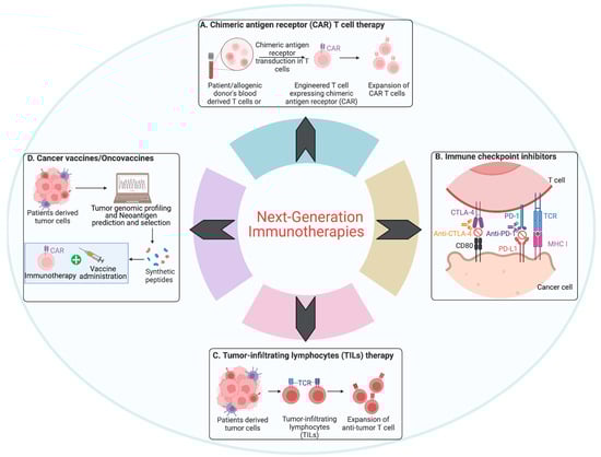 The field of immunotherapy is undergoing rapid advancements, with novel approaches aimed at improving the efficacy and range of treatments available for various cancer types. Prominent strategies include CAR-T cell therapy, immune checkpoint inhibitors (ICIs), tumor-infiltrating lymphocytes (TIL) therapy, and cancer vaccines. These methods mark significant progress in leveraging the immune system to fight cancer more effectively [31] (Figure 1).
