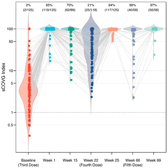 Immunogenicity of a third, fourth, and fifth dose of BNT162b2 vaccine in 162 healthcare workers. Response measured using a semi-quantitative serological assay, which reports a value (sCOVG index) up to 100.00, where an index ≥1.00 is considered positive for SARS-CoV-2 antibodies. Each dot represents one case, with gray lines connecting the same individual across longitudinal measurements. The width of the violin plot represents the distribution of the data along the y-axis. Following the third, fourth, and fifth doses, the sCOVG index remained >100.00 (the upper limit of quantification) in 95%, 94%, and 97% of individuals, respectively (labeled on top). The baseline levels prior to each dose display a gradual increase.