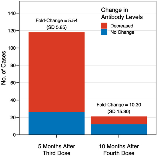 - Kusunoki, H.; Ohkusa, M.; Iida, R.; Saito, A.; Kawahara, M.; Ekawa, K.; Kato, N.; Motone, M.; Shimizu, H. Increase in antibody titer and change over time associated with severe acute respiratory syndrome coronavirus 2 infection after MRNA vaccination: Consideration of the significance of additional vaccination. Clin. Case Rep. 2024, 12, e8953. [Google Scholar] [CrossRef]