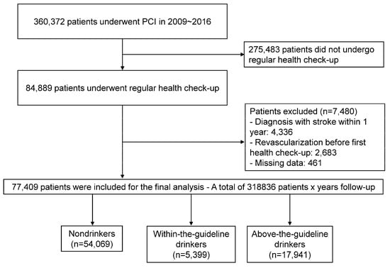 We analyzed data from the Korean NHIS database. This database includes claims, health check-ups, and death information for people in the Republic of Korea. It includes baseline demographic information, diagnostic codes for diseases, data on in-patient and out-patient service usage, medication prescriptions, and mortality records. The NHIS serves as the sole insurer in the Republic of Korea, covering 97% of the South Korean population. All Koreans enrolled in the NHIS are recommended to undergo regular health check-ups at least every alternate year. We enrolled 84,889 patients who underwent a health check-up within 1 year after the index PCI, among 360,372 patients who underwent PCI between 1 January 2009 and 31 December 2016. To avoid confounding by pre-existing conditions, we excluded those with a history of stroke (International Classification of Diseases [ICD]-10 I63, 64) within one year after the index PCI (n = 4336) and those who underwent redo PCI before the first regular health check-up (n = 2683). After excluding those with missing data on alcohol consumption (n = 461), the final study population consisted of 77,409 individuals (Figure 1). The follow-up duration was from the date of the health check-up to the date of the occurrence of any clinical event or 31 December 2017, whichever occurred earlier. This study was conducted in compliance with the Declaration of Helsinki and received approval from the Institutional Review Board of the Seoul National University Hospital. Informed consent was waived for this study, as it relied on the anonymized database created by the NHIS.