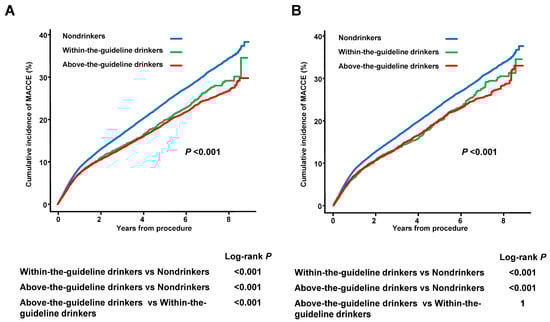 The Kaplan–Meier Curves for MACCE According to Drinking Status in Crude (A) and IPW-matched Populations (B). The Kaplan–Meier curves demonstrated the highest MACCE incidence in non-drinkers and the lowest in above-the-guideline drinkers in both the crude and IPW populations (log-rank p < 0.001). n = 77,409. A log-rank test was utilized for statistical analyses. IPW, inverse probability-weighted; MACCE, major adverse cardiovascular and cerebrovascular events.