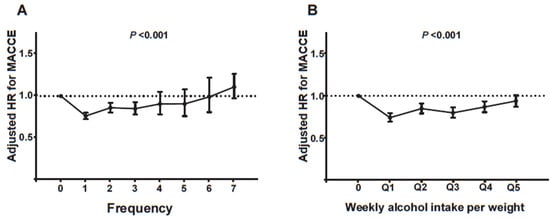 A more detailed analysis of the relationship between drinking frequency or body weight-adjusted drinking amount and clinical outcomes was performed. Interestingly, drinking frequency, defined by the number of drinks consumed per week, showed a characteristic J-curve relationship with the IPW-aHR of MACCE (Figure 3A). The MACCE risk was the lowest in patients who drank alcohol once a week and gradually increased with alcohol intake frequency. Notably, patients who drank daily exhibited a non-significant tendency to have a higher MACCE risk than non-drinkers (daily drinkers vs. non-drinkers; aHR, 1.108; 95% CI, 0.974–1.260).