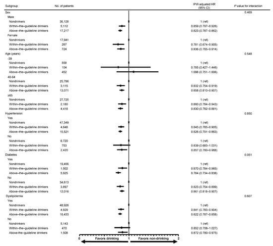 All numerical data were presented as mean ± standard deviation for continuous variables and as percentages for categorical variables. The incidence rate for each outcome was determined as the number of events divided by the follow-up duration (per 1000 person-years). If combined end-points occurred in a patient, the first event was recorded. The Kaplan–Meier method was used to estimate the rate of time-dependent events, and clinical outcomes were compared using the log-rank test. To reduce the impact of potential confounding factors, we applied an inverse probability-weighted (IPW) Cox regression with a robust variance estimator. The probability was estimated using a multinomial logistic regression model with age, sex, hypertension, diabetes mellitus, dyslipidemia, body mass index, social income, regular exercise, and smoking status. The results were presented as adjusted hazard ratios (aHRs) with 95% confidence intervals (CIs) for end-points. In the subgroup analysis, aHR and 95% CI of the within-the-guideline or above-the-guideline drinker groups were compared with those of the non-drinker group. A two-sided p-value of less than 0.05 was considered statistically significant for all analyses. Statistical analyses were conducted using Statistical Analysis Software version 9.4 (SAS Institute, Cary, NC, USA).