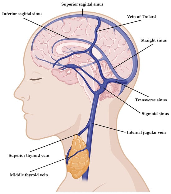 Thyrotoxicosis has been associated with the risk of venous thrombosis, with an odds ratio (OR) of 2.2 (95%CI 1.0–4.6) []. Given that the literature describes the co-occurrence of thyrotoxicosis and CVT in >50 case reports, it seems that beyond the increased risk of deep vein thrombosis [], thyroid hormone excess is specifically associated with an increased risk of CVT. The precise mechanisms have yet to be elucidated, considering that they are difficult to study due to the very low incidence of CVT []. Nevertheless, looking at the anatomy of the cerebral venous system (Figure 1), in some cases of thyroid storm, there might be a mechanical factor contributing to CVT, which is the presence of a goiter reducing the venous outflow from the cranial district (internal jugular vein). In addition, it has to be noted that the superior and middle thyroid veins open into the internal jugular veins with very few variations [].