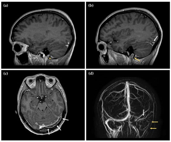 Magnetic resonance imaging of the illustrative case history. Sagittal 3D contrast-enhanced T1-weighted images showing (a) normal contrast enhancement in the right transverse sinus (white arrowhead) and internal jugular vein (yellow arrowhead); (b) a filling defect in contrast enhancement in the left transverse sinus (white arrow) and the left internal jugular vein (yellow arrow), indicating cerebral venous thrombosis; (c) axial 3D contrast-enhanced T1-weighted image showing an extensive filling defect in contrast enhancement within the left transverse sinus (white arrows); (d) magnetic resonance venography showing no vascular signal on the left transverse and sigmoid sinus (white arrow) extending to the left internal jugular vein (yellow arrows).