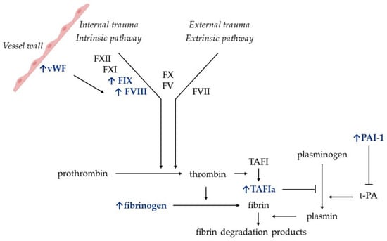 Most of the effects of thyroid hormones on the coagulation and fibrinolysis systems are mediated by the thyroid hormone receptor β (THRβ), which is widely expressed in the liver, as well as in endothelial cells, which are the source of production of FVIII, FIX and vWF. This has been demonstrated by comparing the parameters of coagulation and fibrinolysis in patients with thyroid hormone excess due to hyperthyroidism vs. defective thyroid hormone receptor β (THRβ). The results indicate that hyperthyroid patients exhibit higher levels of FVIII, fibrinogen, and vWF than those with defective THRβ []. Burggraaf et al. found that thyrotoxicosis increased the plasma levels of most endothelial marker proteins, such as vWF, tissue plasminogen activator (t-PA), PAI-1, and thrombomodulin, and of some liver-synthetized proteins [], highlighting that in cases of thyroid hormone excess, there is also an endothelial activation, which might contribute to the thrombotic risk.