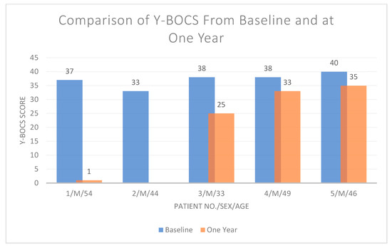 At the end of the two-year period of treatment/observation, patients had trialed 4.3 new psychiatric medications and were on three medications on average at the end of observation (Table 4). Baseline symptomatology scores for Y-BOCS, HAM-A, and HAM-D are compared to their corresponding scores after one year of DBS treatment in Table 5, Table 6 and Table 7, respectively. The corresponding changes for Y-BOCS (Figure 1), HAM-A (Supplementary Figure S1), and HAM-D (Supplementary Figure S2) are also displayed graphically. One out of the five patients receiving DBS treatment was found to be a responder to treatment (Y-BOCS score > 35%) (Table 5).
