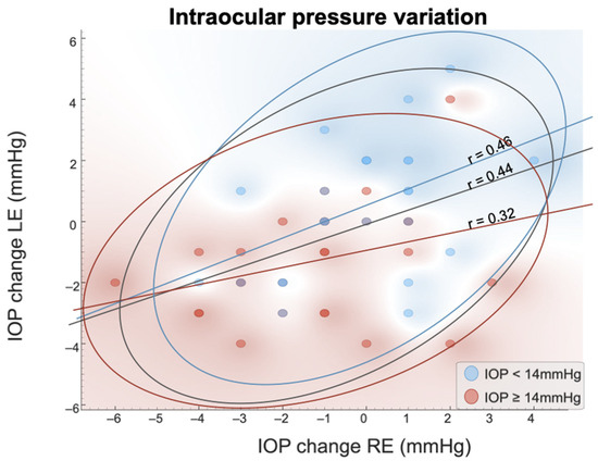 Changes (post–pre) in the intraocular pressure (IOP) of the right (RE) and left eye (LE). Notes for the figure: The colors represent the participants with baseline IOP (average IOP of both eyes) below or above 14 mmHg. Color regions and confidence ellipses were automatically created. The lines represent the correlation between the eyes.