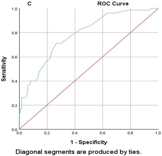 ROC curve using mean NEWS-2 scores for (A) patients admitted to the ICU; (B) mortality; and (C) patient’s hospitalization stay for ≥six days. The red line expresses the reference line; however, the blue line expresses the mean NEWS-2.