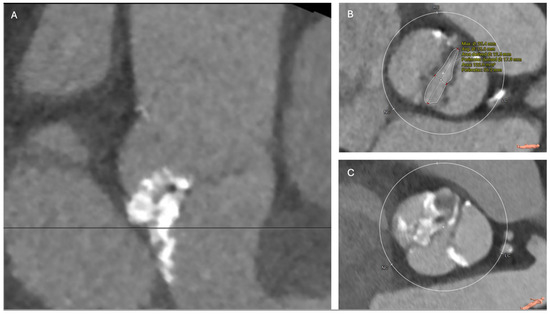 Bicuspid Aortic Valve Stenosis with High-Risk Features. Examples of bicuspid aortic stenosis pathology with increased complication risk due to severe calcification or abnormal valve morphology. (A) Sievers 1 bicuspid with severe calcification of the aortic valve leaflets extending into the left ventricular outflow tract, calcium score 11,017, (B) Sievers 0 bicuspid with large annulus sizing for the largest TAVR valves (perimeter 89.5mm and aortic valve area 634 mm2), with an elliptical orifice (25.4 mm × 15.6 mm) at the level of the leaflets, making valve selection difficult, (C) Sievers 0 bicuspid with a large annulus (perimeter 90.3 mm and area 637.4 mm2), dilated sinus of Valsalva measuring 45 mm, and heavy calcium and abnormal morphology at the leaflet level.