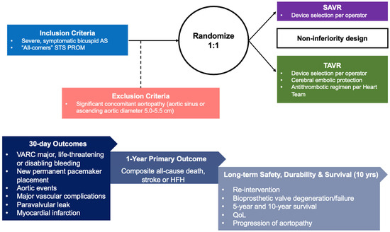 Proposed Study Design. AS: aortic AS; HFH—heart failure hospitalization; SAVR—surgical aortic valve replacement; STS PROM—Society of Thoracic Surgeons Predicted Risk of Mortality; TAVR—transcatheter aortic valve replacement; QoL—quality of life; VARC—valve academic research consortium.