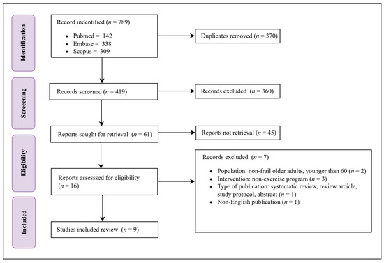 A total of 789 studies were initially collected throughout the search (142, 338, and 309 studies from PubMed, Embase, and Scopus, respectively). Out of them, 370 studies were identified as duplicates and were therefore removed. The topic and abstract of the remaining 419 studies were evaluated. Following the exclusion of 360 records, 61 reports were sought for retrieval, of which 45 were not retrievable. For eligibility assessment, 16 studies were reviewed against the eligibility criteria and then 7 studies were excluded because they were either not entire texts or did not meet the eligibility criteria due to incompatible factors. As a result, there were nine studies that met the criteria for the systematic review [28,31,32,33,34,35,36,37,38] (Figure 1).