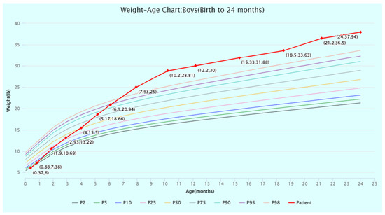 Weight-for-age percentiles for boys (birth to 24 months) from the World Health Organization (WHO) Child Growth Standards. The patient’s weight at timepoints from birth to 24 months of age is displayed and plotted (in red) against the WHO percentiles. Source: WHO Child Growth Standards (https://www.who.int/tools/child-growth-standards/standards (accessed on 1 July 2024)). Abbreviation: P, percentile.