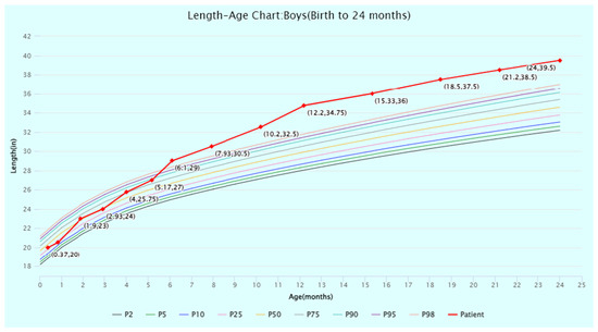 Length-for-age percentiles for boys (birth to 24 months) from the World Health Organization (WHO) Child Growth Standards. The patient’s length at timepoints from birth to 24 months of age is displayed and plotted (in red) against the WHO percentiles. Source: WHO Child Growth Standards (https://www.who.int/tools/child-growth-standards/standards (accessed on 1 July 2024)). Abbreviation: P, percentile.