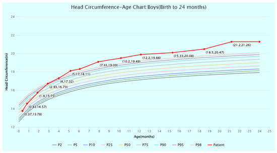 Head circumference-for-age percentiles for boys (birth to 24 months) from the World Health Organization (WHO) Child Growth Standards. The patient’s head circumference at timepoints from birth to 24 months of age is displayed and plotted (in red) against the WHO percentiles. Source: WHO Child Growth Standards (https://www.who.int/tools/child-growth-standards/standards (accessed on 1 July 2024)). Abbreviation: P, percentile.