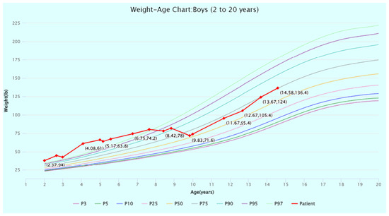 Weight-for-age percentiles for boys (2 to 20 years) from the Centers for Disease Control (CDC) Growth Charts. The patient’s weight at timepoints from 2 to 14 years of age is displayed and plotted (in red) against the CDC percentiles. Source: CDC Growth Charts (https://www.cdc.gov/growthcharts/cdc-growth-charts.htm (accessed on 1 July 2024)). Abbreviation: P, percentile.