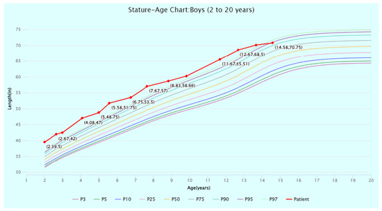 Stature-for-age percentiles for boys (2 to 20 years) from the Centers for Disease Control (CDC) Growth Charts. The patient’s stature at timepoints from 2 to 14 years of age is displayed and plotted (in red) against the CDC percentiles. Source: CDC Growth Charts (https://www.cdc.gov/growthcharts/cdc-growth-charts.htm (accessed on 1 July 2024)). Abbreviation: P, percentile.