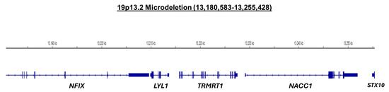 - Dong, H.Y.; Zeng, H.; Hu, Y.Q.; Xie, L.; Wang, J.; Wang, X.Y.; Yang, Y.F.; Tan, Z.P. 19p13.2 Microdeletion including NFIX associated with overgrowth and intellectual disability suggestive of Malan syndrome. Mol. Cytogenet. 2016, 9, 71. [Google Scholar] [CrossRef] [PubMed][Green Version]