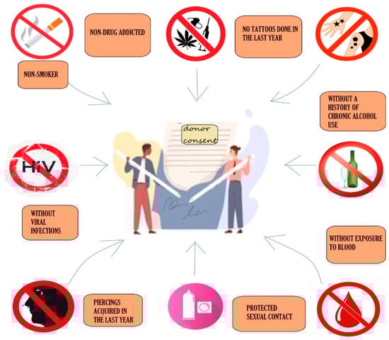 The success of FMT is initially determined by the donor–recipient relationship, including their compatibility, adherence to treatment and willingness to accept this innovative method compared to other types of transplantation. An essential factor in this selection process is screening, as less than 20% of all potential donors are deemed suitable for the procedure [48]. Donor screening encompasses several conditions, beginning with a physical examination and a review of personal medical history, following a process similar to that for blood donors. Donors of legal age must provide informed consent, while minors require both their consent and that of their parents. Donors are not allowed to consume toxic substances, have tattoos, piercings, infectious symptoms in the last month, exposure to blood in the last year or a hereditary history of colorectal cancer and other gastrointestinal diseases. Potential donors have their blood drawn for virus testing (HIV, hepatitis, Epstein–Barr and others), antibodies and certain serologies, and then their stool is tested [49]. Figure 1 presents some of the main contraindications for donors.