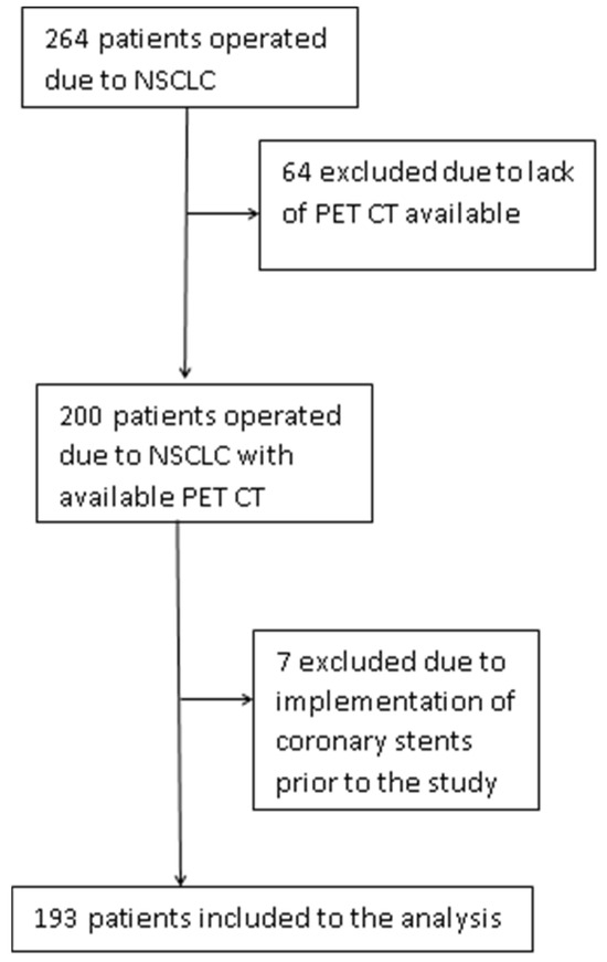 In this retrospective cohort study, the data of the patients who were surgically treated for NSCLC in the Thoracic Surgery Department Medical University of Gdansk, Poland were matched with the reassessed preoperative CT images. The postoperative complication rates and overall survival were analyzed. The clinical data were extracted from the KBRP (Krajowa Baza Raka Pluca—National Registry of Lung Cancer). The data in the KBRP are collected prospectively. The data of every consenting patient treated surgically due to NSCLC in Poland are included in this obligatory database. The data were made available for the contributing researchers. The CTs for CAC evaluation were extracted from the Positron Emission Tomography Computed Tomography (PET CT) images and downloaded from the UCK-PACS radiological server. The overall survival data were obtained from the KBRP. The data of 264 patients that were operated on between 4 January 2018 and 6 March 2019 were included. Finally, 193 patients who were operated on due to NSCLC had their PET CT performed preoperatively, and the scans were made available for the automated CAC analysis in this study. The study flowchart illustrating the inclusion criteria for the study is presented in Figure 1. The data were stored in the anonymized version to avoid violating the General Data Protection Regulation. This analysis was approved by the Ethics Committee of the Medical University of Gdansk, which waived individual patient consent due to the observational character of the study.
