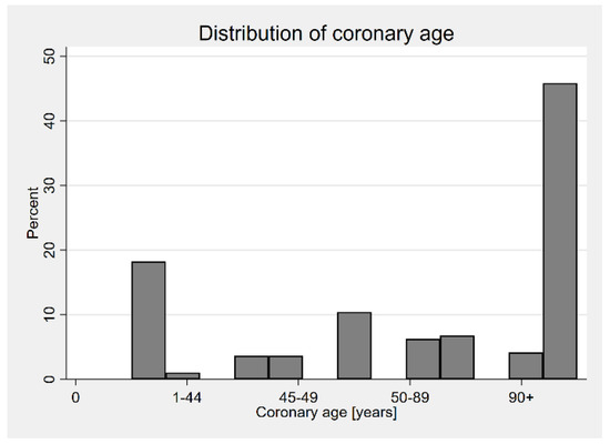 The CAC score was evaluated automatically by the principal investigator (TM) using the Syngo.via Siemens Healthcare VB60S_HF1 (Malvern, PA, USA) software. The measurements were performed utilizing the Agatson CAC score algorithm. The exact result of the CAC score was assessed on the basis of the Ca-Score function of the Syngo.via platform. In the paper by Hoff et al., coronary age was assessed using electron beam tomography [8]. The study involved 35,246 asymptomatic individuals aged 30 to 90 years. The CAC score, which reflected the amount of calcium in the coronary arteries, was calculated based on the number, area, and peak density of calcific lesions detected. The researchers developed age- and gender-specific distributions of CAC scores to serve as standards for clinical interpretation. These distributions allowed a comparison of an individual’s CAC score with those of others in the same age and gender group, providing a percentile ranking. This ranking allowed an estimation of the “coronary age” of a patient, which can be higher or lower than their chronological age depending on their CAC score. The data concerning the total CAC score, coronary age, and CAC score of coronary arteries were aggregated.