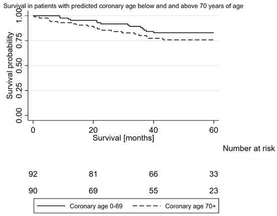 No opposite trends were observed. The Kaplan–Meier curves were the most significantly separated in the case of the survival analysis in the two groups of patients with cardiac ages pf 0–69 years of age and 70+ (92 vs. 92 patients). In the log rank test, the p = 0.137. In the Cox regression analysis, the HR = 1.678, 95%CI 0.847–3.292 p = 0.138 (Figure 5).