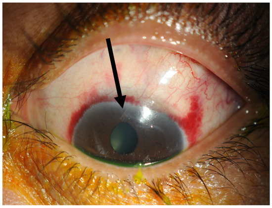 One week post-operatively. The tube marked with a black arrow is situated in the anterior chamber and the conjunctiva has already healed within one week.