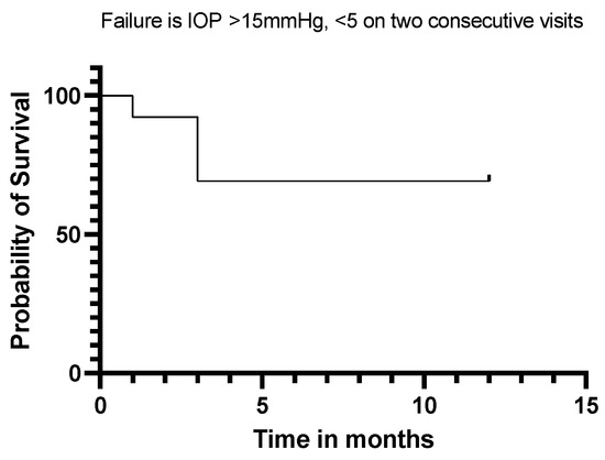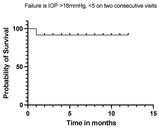 Twelve (92%) of our eyes achieved qualified success when using IOP < 21 mmHg and IOP < 18 mmHg as the definition (see Figure 5 and Figure 6). Qualified success dropped to 69% when the IOP was defined as less than 15 mmHg (Figure 7).