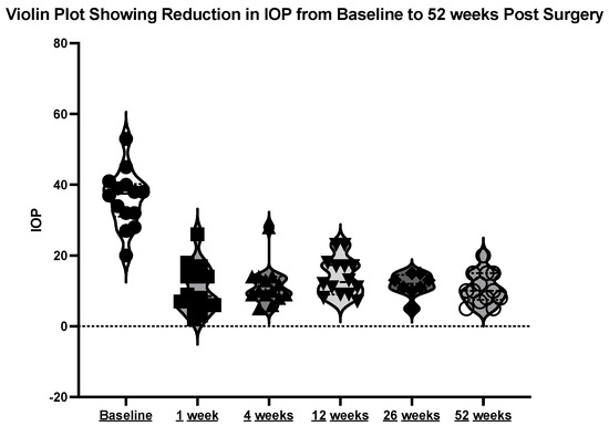 The mean initial intraocular pressure (IOP) was 35.69 mmHg (±8.41), with a range between 20 and 53 mmHg. At week one post-operation, the mean IOP was 9.15 mmHg (±5.71). At week four post-operation, the mean IOP was 11.31 mmHg (±5.74). At month three post-operation, the mean IOP was 13.69 mmHg (±5.42). At month 12 post-operation, the mean IOP was 11.08 mmHg (±4.31). See the violin plot in Figure 8.