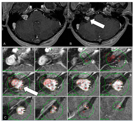 - Takahashi, S.; Ishii, Y.; Aizawa, Y.; Sato, A.; Nemoto, S. A case of ruptured aneurysm in the internal auditory canal 28 years after Gamma Knife radiosurgery for a vestibular schwannoma. Surg. Cereb. Stroke 2023, 51, 227–230. [Google Scholar] [CrossRef]