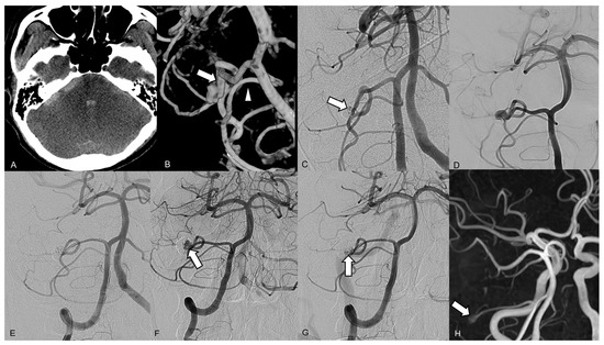On admission computed tomography (CT), a diffuse subarachnoid hemorrhage was revealed with a predominance of distribution in the right cerebellopontine angle cistern, and a small intraventricular hemorrhage was noted (Figure 2A). Brain CT angiography showed a small contrast pooling near the tumor without a definite connection to the regional vascular structure. Diagnostic catheter angiography revealed a lobulated wide-neck aneurysm arising from the right distal AICA at a meatal segment (Figure 2B). The aneurysm was located at a nonbranching site. A robust right AICA, with a diameter larger than that of the ipsilateral posterior inferior cerebellar artery (PICA), stemmed from the right AICA–PICA complex. Subsequently, endovascular therapy was attempted under general anesthesia. After positioning a 6 Fr guiding catheter in the right vertebral artery, we placed a Headway 17 microcatheter (MicroVention, Aliso Viejo, CA, USA) with a preshaped tip angle of 90° into the aneurysmal lumen over a microwire. Endosaccular coil embolization was performed using five coils, successfully preserving the parent artery and leaving a tiny remnant portion of the neck (Figure 2C). The patient was discharged without any neurologic deficits. Follow-up TOF MR angiography and conventional angiography 3 months after the endovascular procedure revealed recanalization of the coiled pseudoaneurysm, with regrowth of the aneurysm sac from the residual neck (Figure 2D). The second endosaccular coil embolization was performed in the same manner, resulting in complete occlusion of the recurred sac on final angiography (Figure 2E). Thereafter, retreatment was performed due to recanalization of the pseudoaneurysm 30 months after the first embolization (Figure 2F,G). No ischemic complications occurred after either endovascular treatment. Since the final embolization, the patient has been undergoing TOF MR angiography check-ups annually, and a 3-mm small remnant sac has remained stable without changes for 4 years (Figure 2H).
