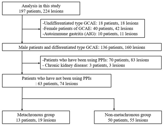 This flowchart shows the classification of male patients with differentiated-type GCAE lesions. Patients were categorized into groups based on long-term PPI use or no PPI use, with exclusion criteria for short-term PPI use.