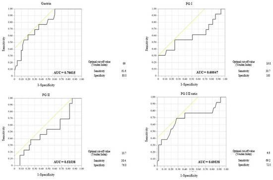 This figure presents receiver operating characteristic (ROC) curves for four serum markers. Gastrin, Pepsinogen I (PG I), Pepsinogen II (PG II), and the PG I/II ratio were used to predict metachronous gastric cancer after the eradication (GCAE) of lesions. Gastrin exhibited the highest diagnostic accuracy, with an area under the curve (AUC) of 0.7661. The optimal cut-off value, determined by the Youden index, was 59, resulting in a sensitivity of 61.6% and a specificity of 80.0%.