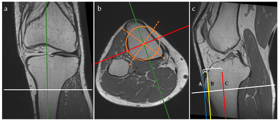 Three-plane view of multiplanar reformatting in the coronal (a), axial (b), and sagittal (c) planes of the 3D PD isovolumetric acquisition and graphical overlay representation of the MRI protocol for the anterior tibial tuberosity index (ATTI) assessment. The lines represent the following: tibial midline sagittal plane (green), coronal plane through the middle of the tibia (red, C), axial plane (white), geometric tibial axes (orange dotted lines) and area (orange circle). Tangent lines through the tuberosity of the anterior tibia (blue line, A), and through the epiphyseal line of the anterior tibial cortex (yellow line, B). Distances between A and B, and A and C, respectively, are marked with accolades.