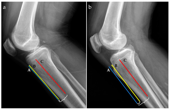 Radiographic lateral views for two patients with low (a) and high (b) anterior tibial tuberosity index (ATTI). The following landmarks are represented: a tangent line at the most prominent point of the anterior tibial tuberosity (blue line, A), the anterior tibial cortex (yellow line, B), and the middle tibial diaphysis (red line, C). Distances between A and B, and A and C, respectively, are marked with accolades.