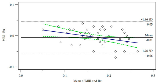 Bland–Altman plot of the differences in the measurements of the two methods, Magnetic Resonance Imaging (MRI) and radiography (Rx). A regression line of differences is presented (blue line) as well as the associated 95% Confidence Interval (dotted green lines). SD = standard deviation.