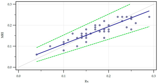 Passing and Bablock regression of the two methods, Magnetic Resonance Imaging (MRI) and radiography (Rx). A regression line (blue line) is featured alongside confidence interval curves (dotted green lines).