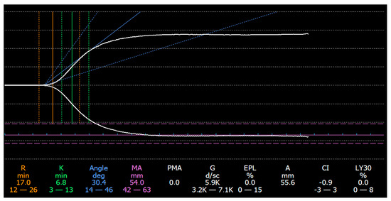 The enzymatic phase, assessing clotting time and the function of the coagulation factors, was assessed using the reaction time (R-time); clot kinetics, depending on the function of fibrinogen, was assessed using the kinetic time (K-time) and the α-angle; platelet function was evaluated using the maximum clot amplitude (MA); and fibrinolysis was assessed using the lysis percentage at 30 min (Ly 30%). The manufacturer provided the reference values for each variable.