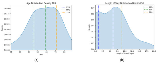Density plots for (a) age variable and (b) length of stay variable for status asthmaticus.