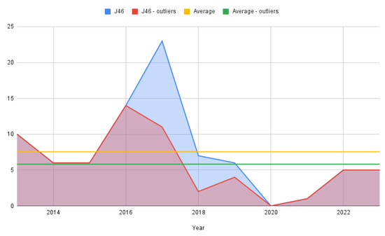 From a dynamic time perspective, simple counting was employed to track yearly evolution due to the relatively small number of cases in the J46 lot (Figure 2). As stated previously, the figure is rendered for the full-status asthmaticus sample as well as for the one that removed the outliers with 0 hospitalization days.