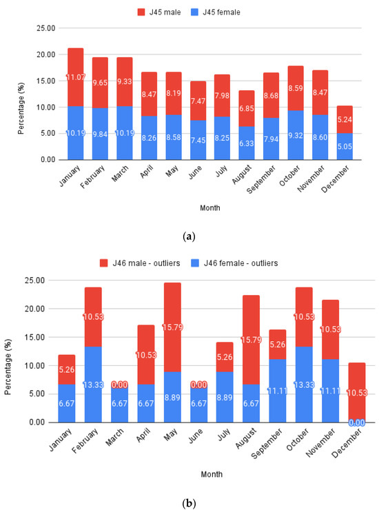 To analyze monthly trends (Figure 3), the number of cases per month was summed throughout the years and expressed as a percentage deviation from the total case number for typical asthma (J45 codes with all their sub-codes) and status asthmaticus (J46 code). The data were further split into males and females, stacking the columns to highlight monthly variations. Each male and female total value equaled 100%. Expressing this as a percentage allows a direct comparison between J45 and J46 evolution.