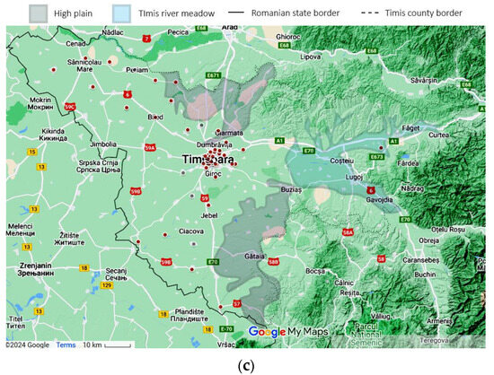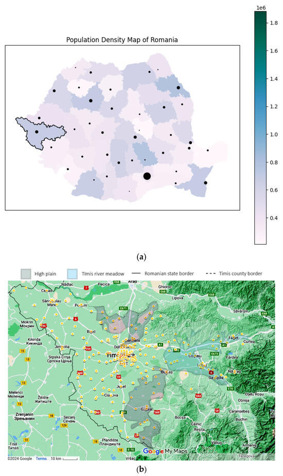 Geographical data, representing the location of the study in a national context: (a) Timis County, marked with a black contour (county color scaled to population density. Municipality size proportional to city population) and patients’ origins for (b) J45 asthma—yellow and (c) J46 status asthmaticus—red, with outliers as gray dots. Statistical data from the Romanian National Statistics Institute. Geospatial data are a correlation between Google Maps and [18].