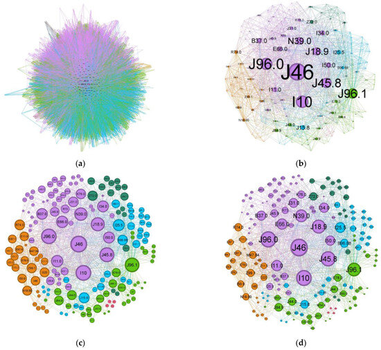 Comparing the status asthmaticus CN to the more common forms of asthma (J45 codes), the diffuse nature present in asthma is much more refined in the former exacerbation (Figure 5). While the graph density for status asthmaticus (0.028) is lower than that of common asthma (0.106), the significantly larger number of nodes and edges in the latter (2231 nodes, 70,708 edges vs. 174 nodes, 1595 edges) obscures potential phenotypic distinctions.